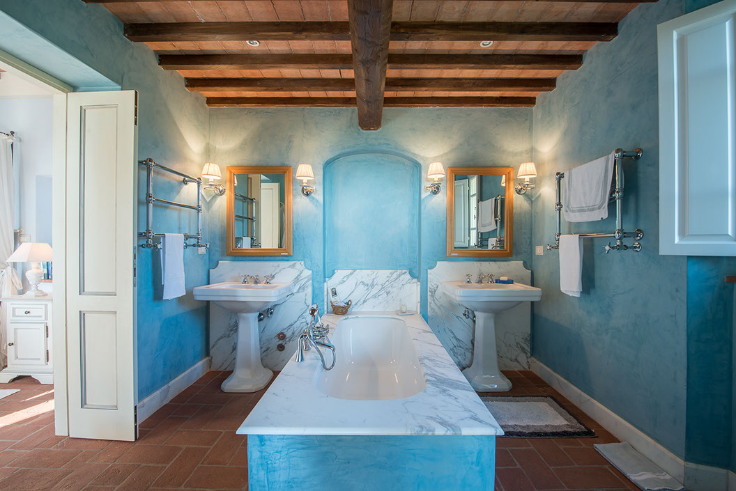 Main bedroom with king sized double bed. French windows opening to balconies overlooking the olive groves and magnificent views. Stunning blue stuccoed en suite bathroom.