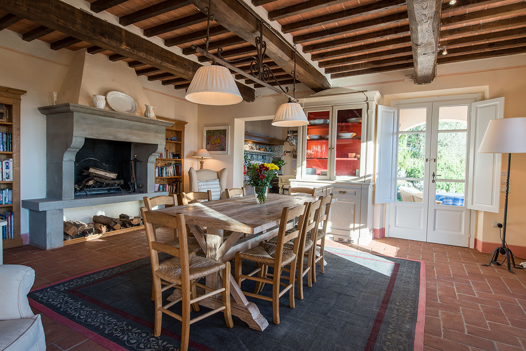 Dining area with open wood fireplace, large French windows opening out onto the terrace.