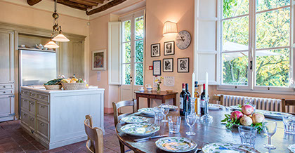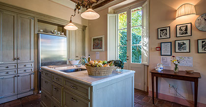 • Fully equipped kitchen/dining area designed by Barthel of Florence. Opening onto the South facing terrace with table, chairs and umbrella.