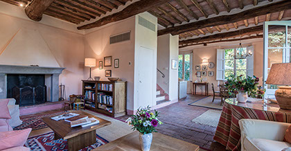 • Comfortable sitting area with open wood fireplace and well stocked bookcase.